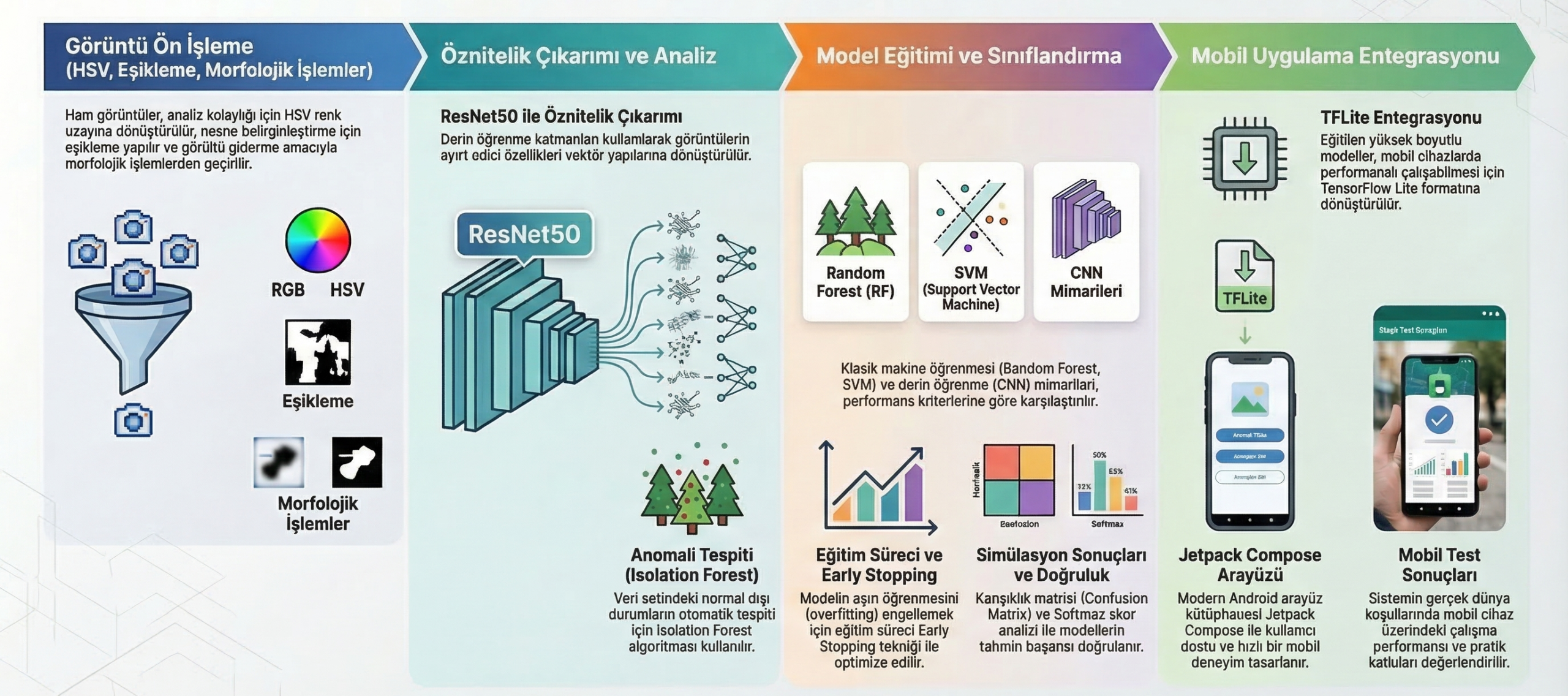 Ön İşleme: Görüntünün 224×224 boyutuna ölçeklenmesi, HSV dönüşümü ve gürültü filtreleme.